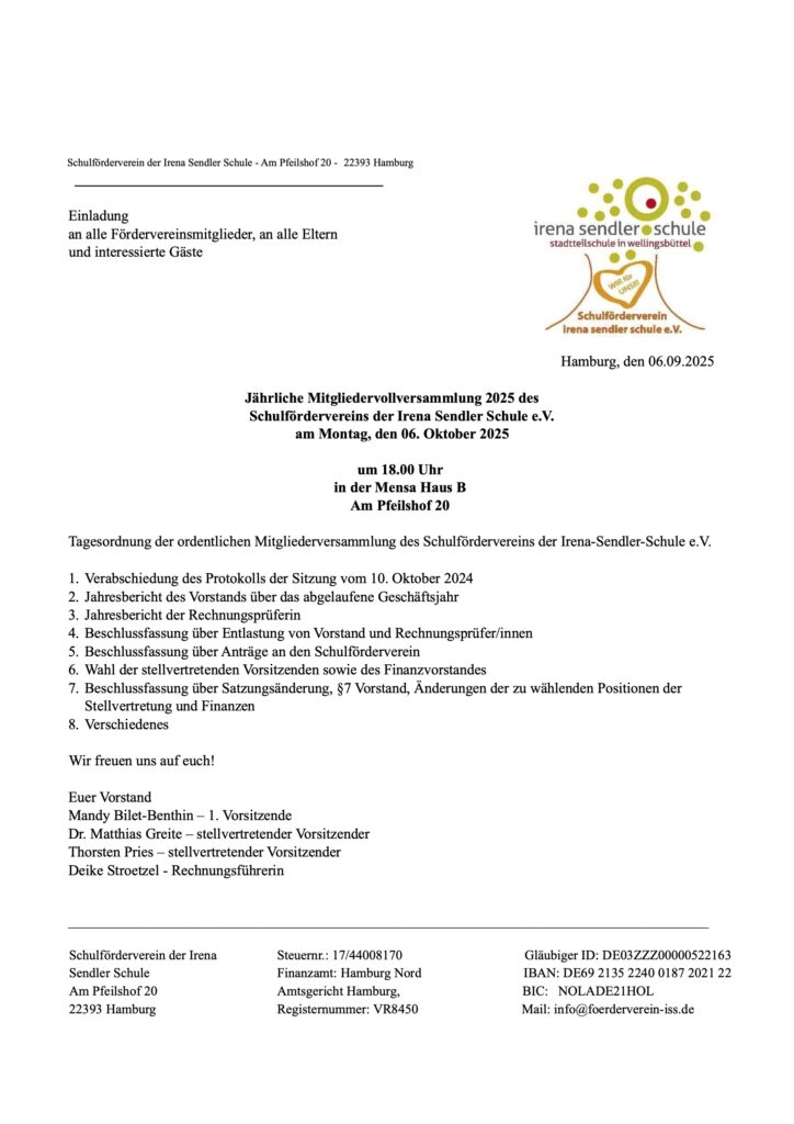 Einladung zur Vollversammlung des Schulfördervereins von Autor · Veröffentlicht 4. September 2025 · Aktualisiert 16. September 2025 Einladung an alle Fördervereinsmitglieder, an alle Eltern und an interessierte Gäste zur Mitgliedervollversammlung 2025 des Schulfördervereins der Irena Sendler Schule e.V. am Montag, den 06. Oktober 2025 um 18.00 Uhr in der Mensa (Haus B):