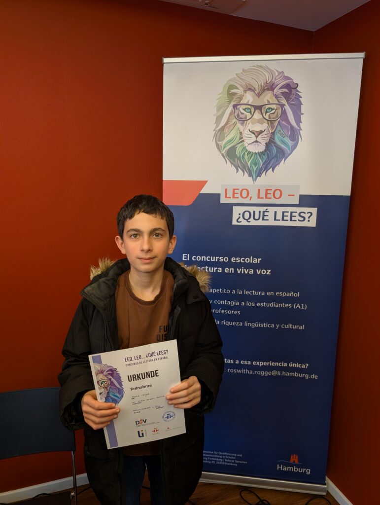 In diesem Jahr war das Niveau besonders hoch, sodass der Jury die Entscheidung alles andere als leicht fiel. Schließlich stand der Sieger fest: Muaz überzeugte mit seinem ausdrucksstarken Vortrag und wurde zum besten Vorleser aller vier Spanischkurse gekürt. Damit durfte er unsere Schule beim hamburgweiten Wettbewerb im Instituto Cervantes vertreten. Dort trafen sich zahlreiche talentierte Teilnehmer:innen aus ganz Hamburg – ein spannender und beeindruckender Nachmittag rund um die spanische Sprache. Muaz hat unsere Schule hervorragend repräsentiert – ¡enhorabuena!