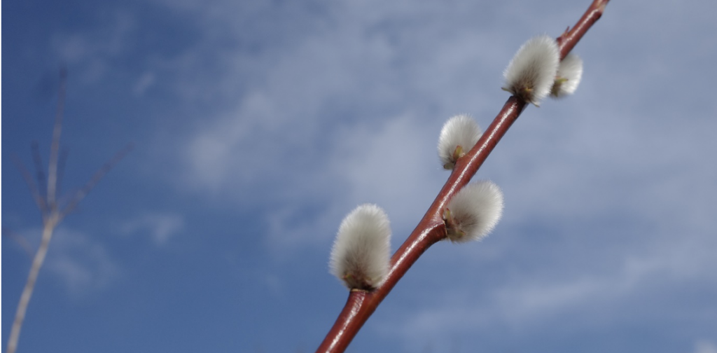 Nachdem die ungewohnt lange Schneephase dieses Winters nun doch vorbei scheint, blühen auch schon die ersten Weidenkätzchen im Schulgarten auf. An der Pommerschen Reifweide präsentieren sich die silberweißen männlichen Blütenstände an den braunrot glänzenden Stielen besonders elegant. Für die Bienen und Hummeln sind die Weidenkätzchen eine der ersten Nahrungsquellen nach der Winterruhe.